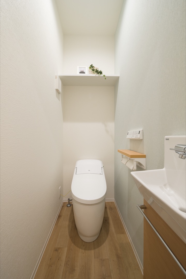 1階のランドリースペースには便利な物入れを完備しました。かさばるタオルや洗剤などの日用品をそのままスッキリ収納できる実用的な設計です。