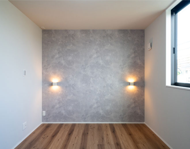 洋室の壁にポイント照明を設置しており、部屋を優しく照らして落ち着いた雰囲気を作り出しています。寝る前にちょっとした読書にも最適です。