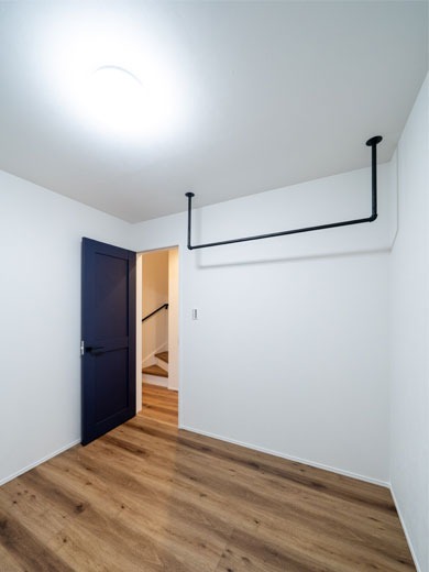 洋室の中にハンガーパイプが設置されており、部屋が広く見えるだけでなく見せる収納としても活用できます。
