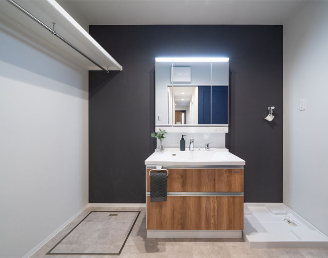 広くゆとりのある洗面脱衣室は収納家具などを置くこともできます。棚とハンガーパイプがあるので、洗濯物を干したりそのまま収納することもできます。