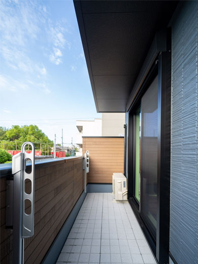 人通りの多い道路と反対側に設けた南向きのバルコニーは、前面に遮る建物が少ないので日当たりも良いです。