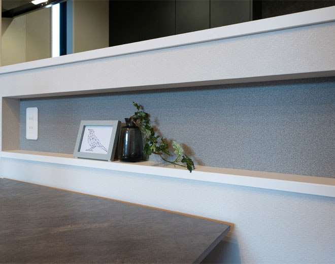 キッチンの横にあるニッチにお気に入りの写真や飾り物などを入れたり、温かい食卓の雰囲気を作り出しています。