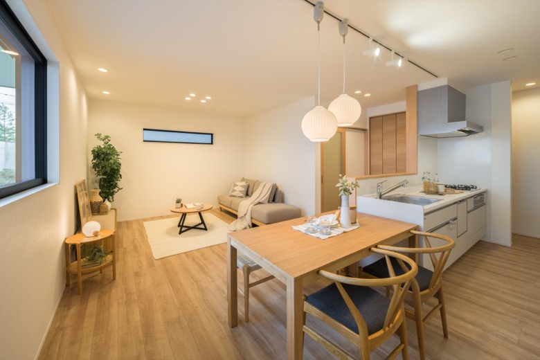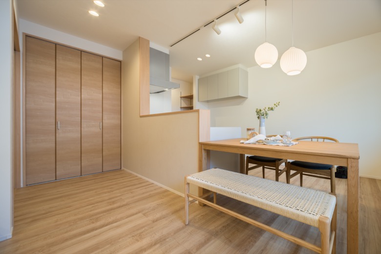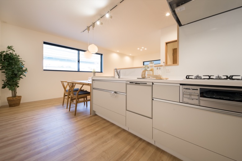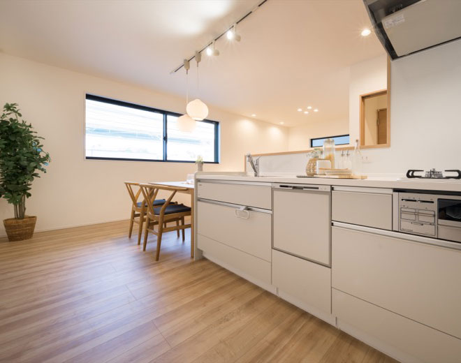 キッチンとダイニングが横並びに配置できるので、作った料理を最短距離で配膳でき、後片付けもスムーズです。調理中もご家族と対面で会話が弾み、家事の時間を楽しい団らんのひとときに変えてくれます。