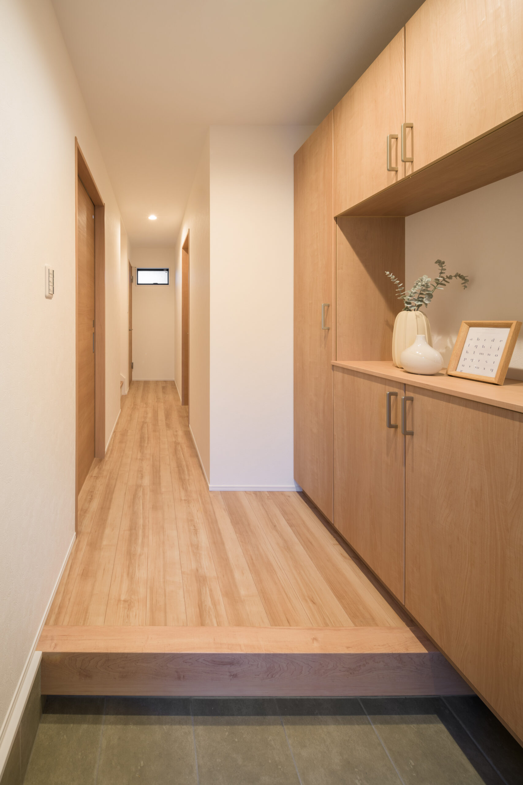 玄関横に植栽があり、家の印象がぐっと明るく華やかになります。緑が目に入ることで、ご家族やお客様を優しく迎え入れる癒やしの空間を演出できます。