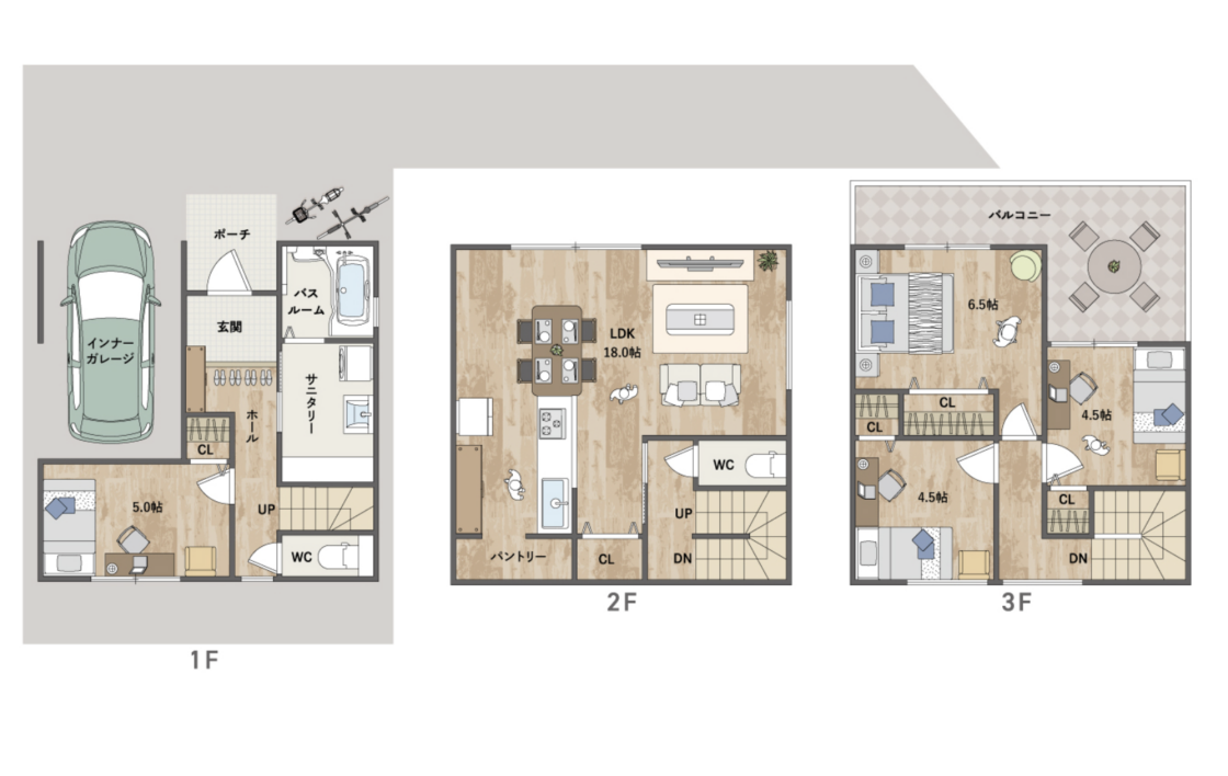 この家は、プライベート感と開放感を両立した、ゆとりある空間がポイントです。1階には雨の日も安心なインナーガレージと、生活動線を考えた水回りを集約。2階は18帖の広々としたLDKにパントリーを備え、家族団らんをゆったり楽しめます。3階には洋室3部屋と、外での食事も楽しめる広いバルコニーを配置。各階にトイレと収納があり、ご家族それぞれの時間も大切にできる機能的な設計が魅力です。