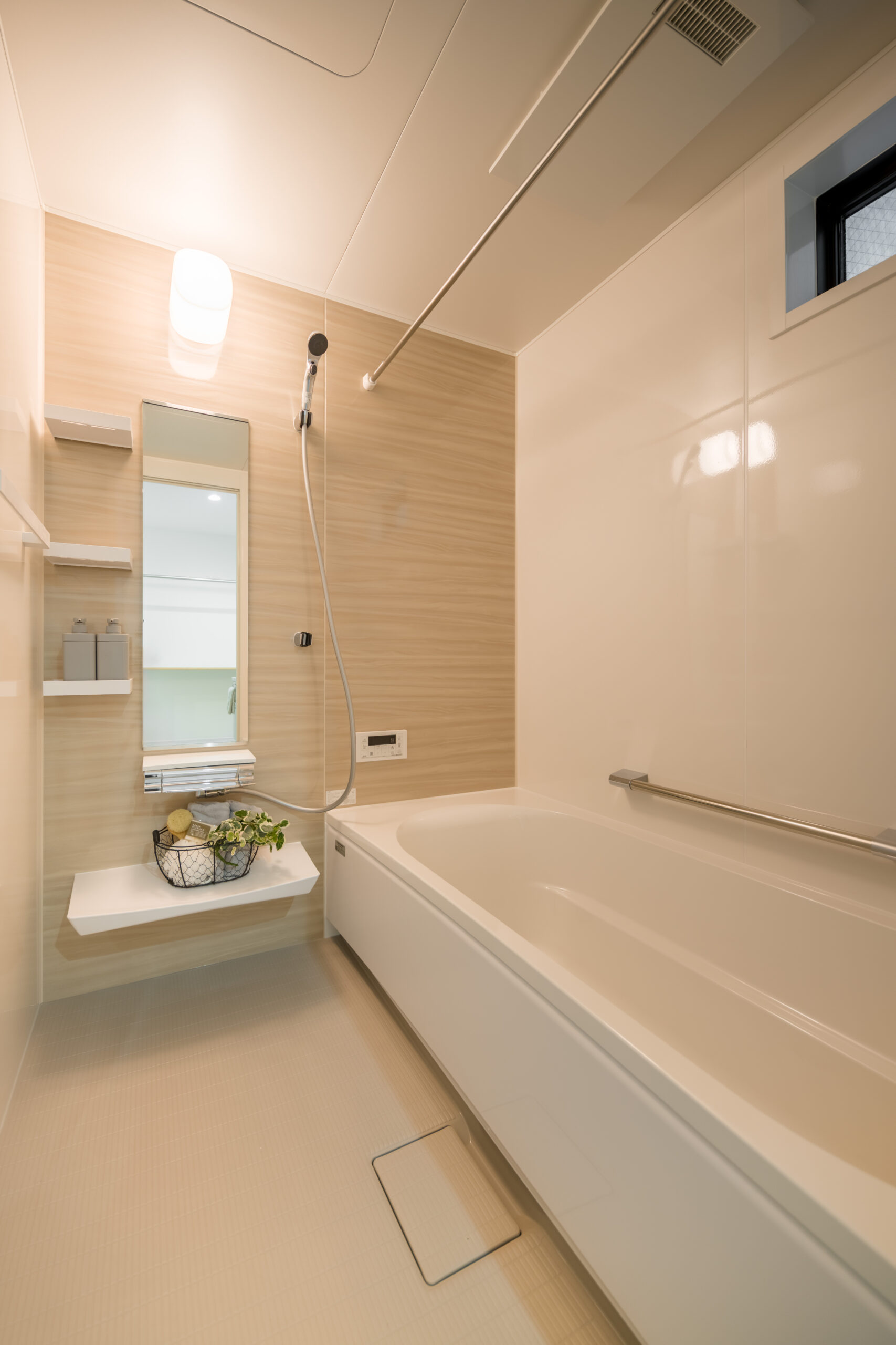 洗面脱衣室が広くカウンターもあるので、洗濯物を畳むなどの家事作業がスムーズに行えます。また、朝の身支度で家族が並んで使っても余裕があり、ゆったりと快適に過ごせます。