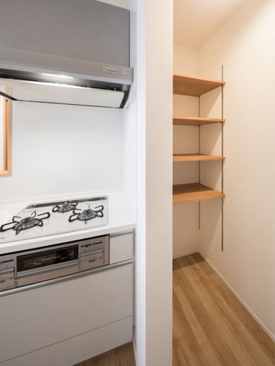 キッチン横にパントリーがあるので、常備菜や大型の調理器具をすっきり収納できます。調理スペースが片付き、生活感を出さずに効率よくお料理を楽しめます。