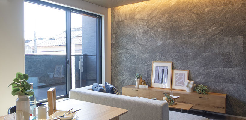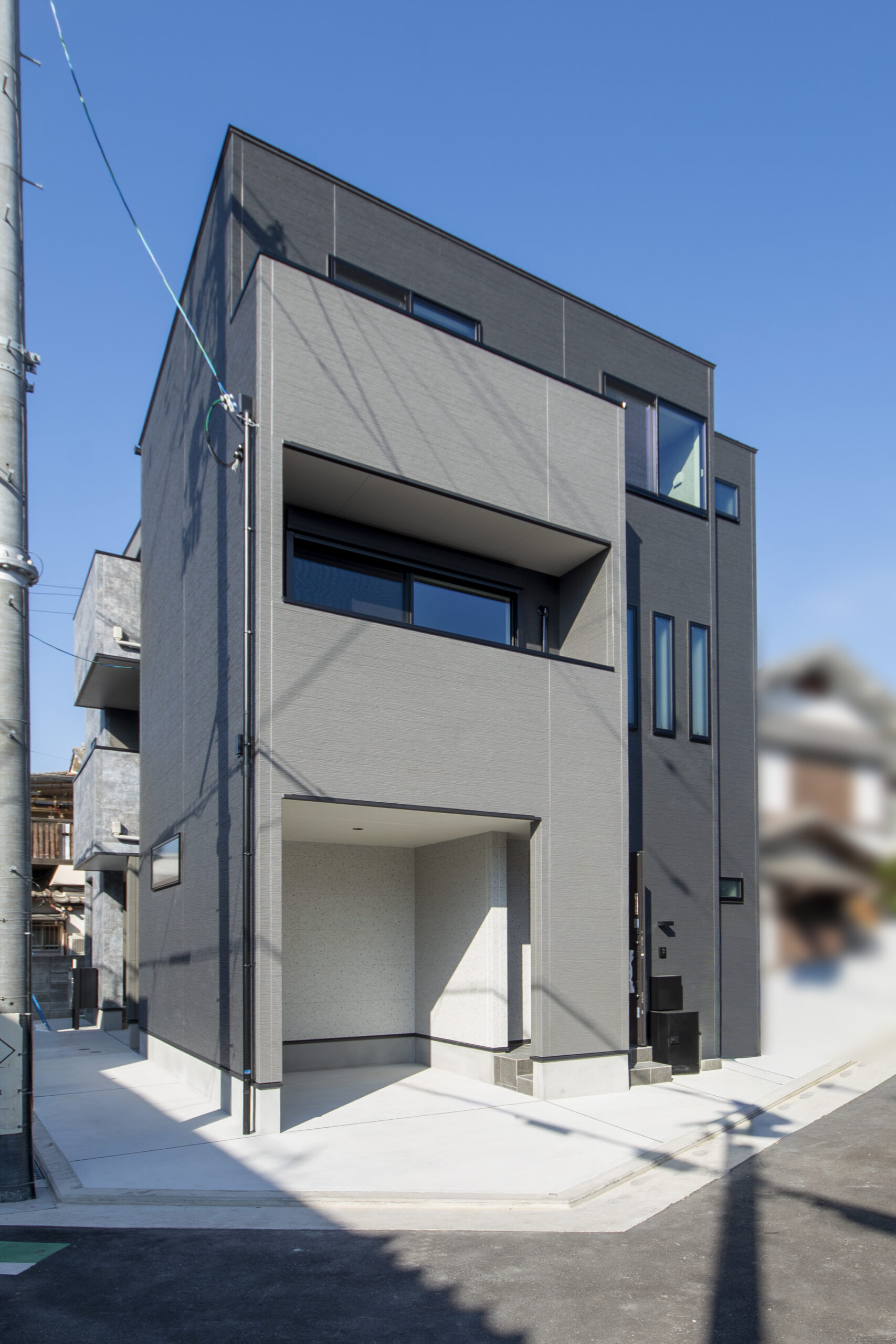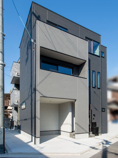 重厚感のある黒と、洗練されたグレーの2トーンカラーを採用。異なる素材と色味を組み合わせることで建物に奥行きが生まれ、都会的でスタイリッシュな存在感を感じられます。