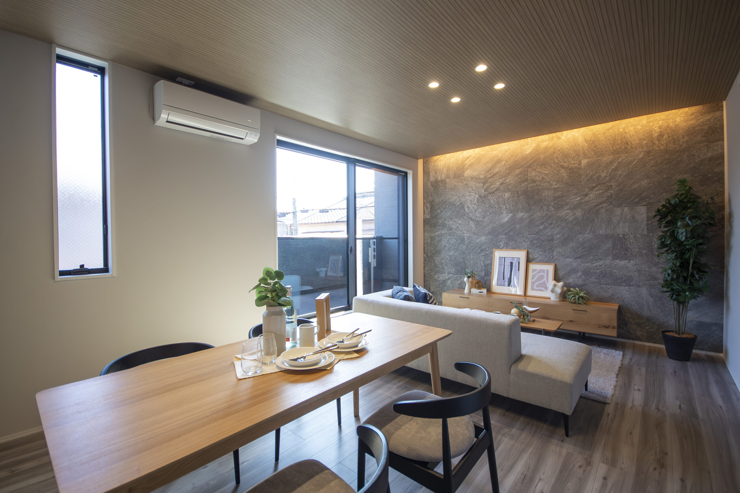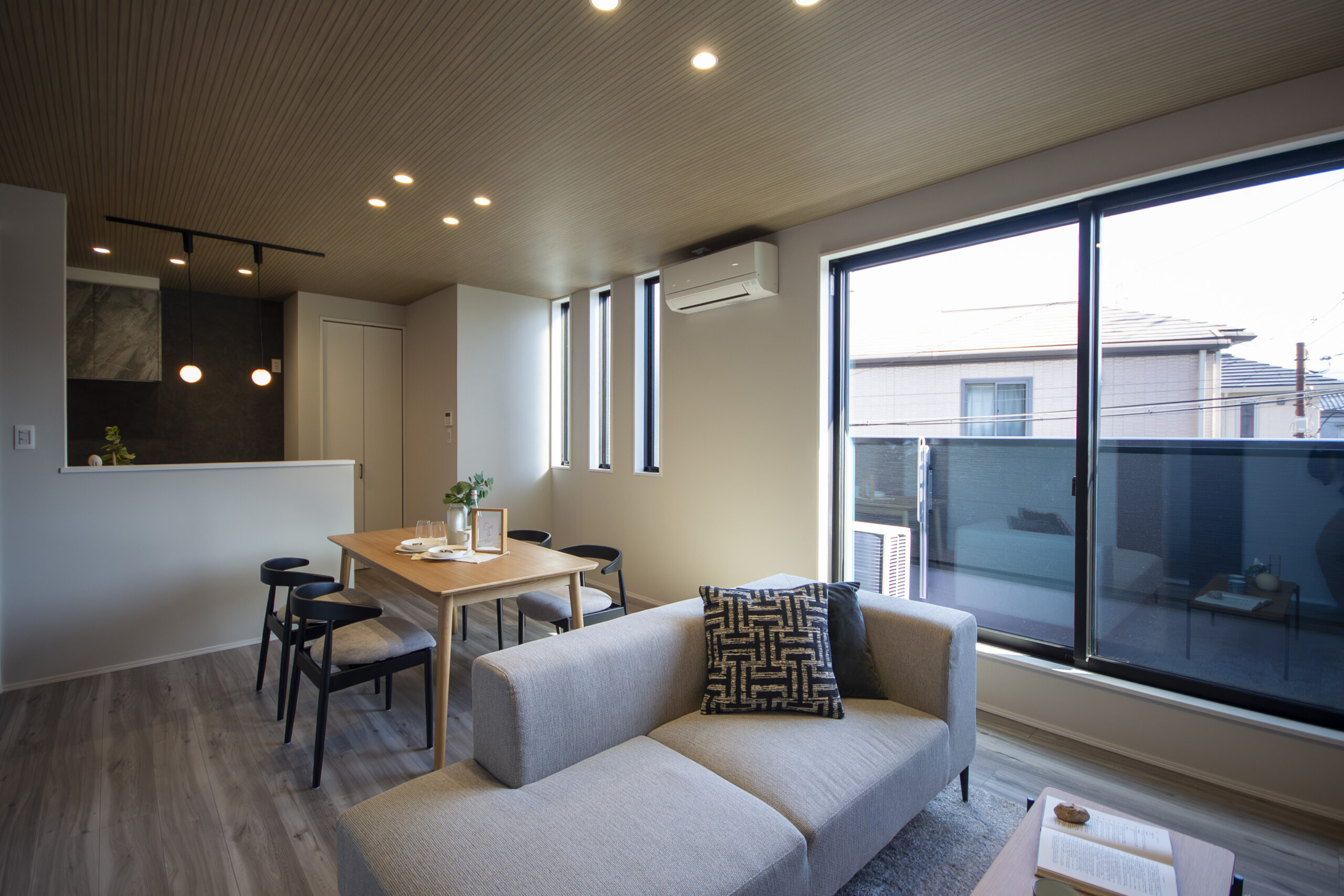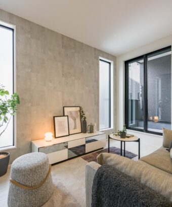 ワイドな窓と3つの縦滑り出し窓から光がたっぷり注ぐ2FのLDK。16.92帖の開放感あふれる空間を、明るい陽光が心地よく包み込みます。