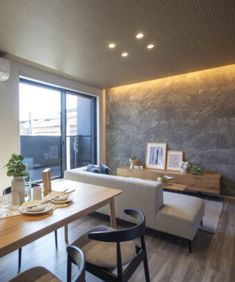 壁一面を優雅に照らす間接照明は、空間に奥行きと上質な落ち着きをもたらします。調光機能で明るさを調整すれば、映画鑑賞や晩酌など、シーンに合わせた寛ぎの演出が可能です。