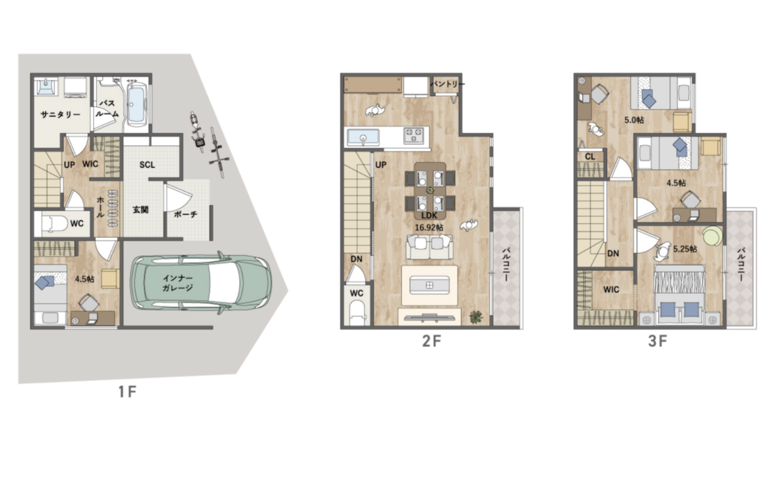大切な車を身近に感じるインナーガレージと、玄関横の大きなシューズインクローゼットが、趣味や外出をスムーズに彩ります。2階へ上がれば、多くの窓から陽光が降り注ぐ明るいLDKが広がり、家族の笑顔を包み込みます。機能的なパントリーや各階の充実した収納、3階のプライベートな居室など、心地よさを隅々まで追求。光あふれる開放感と利便性が調和した、家族の夢を叶える住まいです。