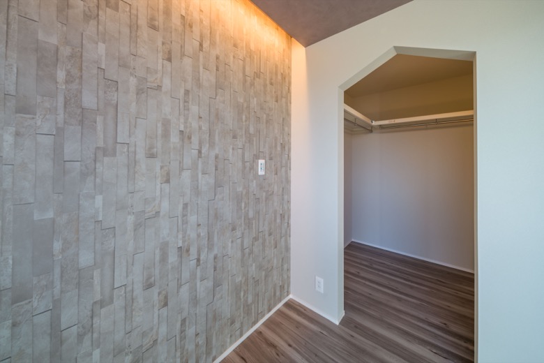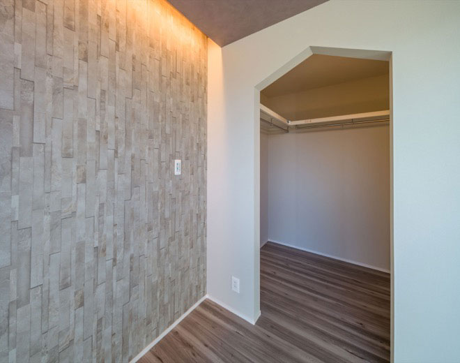 洋室のウォークインクローゼットの入り口を、可愛らしい三角(お家型)の垂れ壁にデザイン。収納スペースへの出入りが楽しくなるような、空間の程よいアクセントになっています。