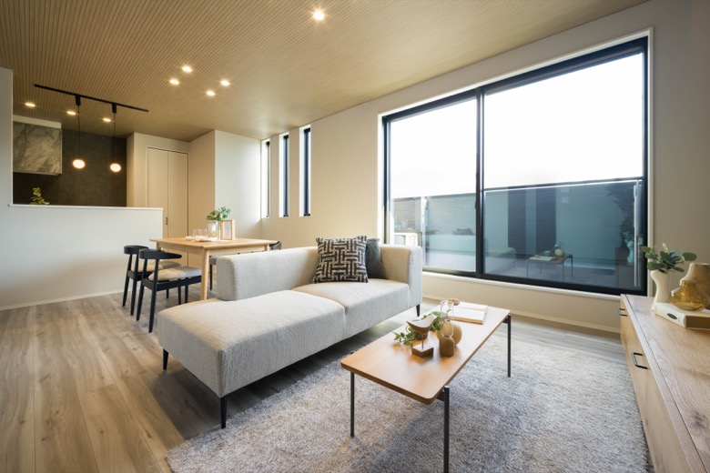 リビングには、デザイン性の高い三連窓を採用しました。外からの視線を程よく遮りながら効率よく採光と通風を確保し、空間に奥行きと明るいリズムをもたらします。