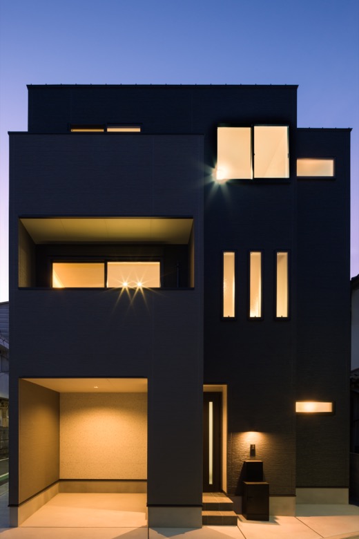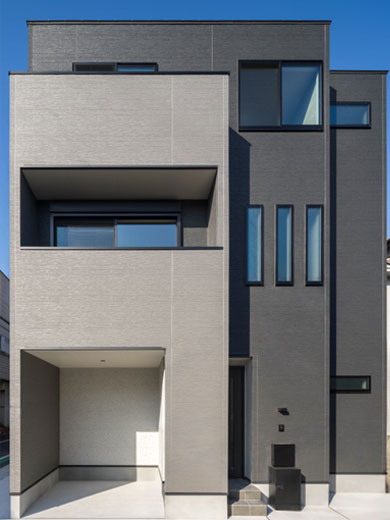 黒と洗練されたグレーを組み合わせた、都会的なツートンカラーの外観。多くの窓がアクセントとなり、室内にたっぷりの陽光を届けながら、外観に軽やかさと表情を与えています。