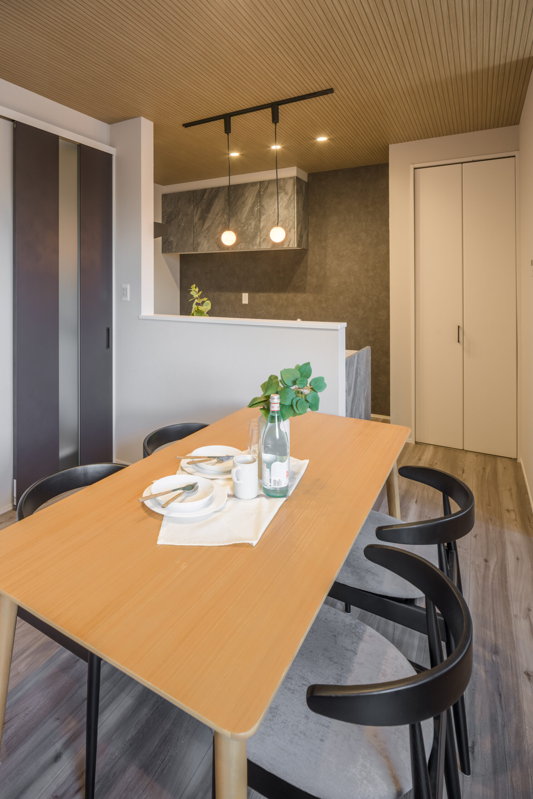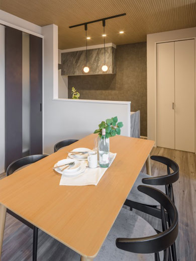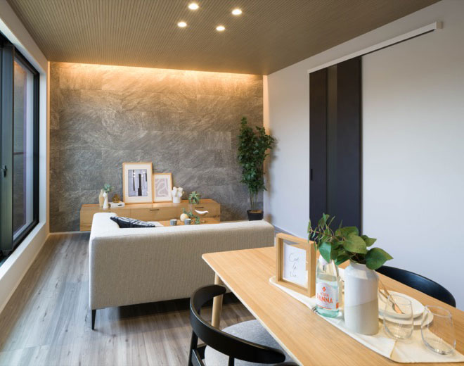 リビングの一角に、調湿・脱臭効果のある機能性タイル「エコカラット」を施工。機能性だけでなく、上質な石目調の質感が空間のアクセントとなり、ワンランク上のインテリアを演出します。