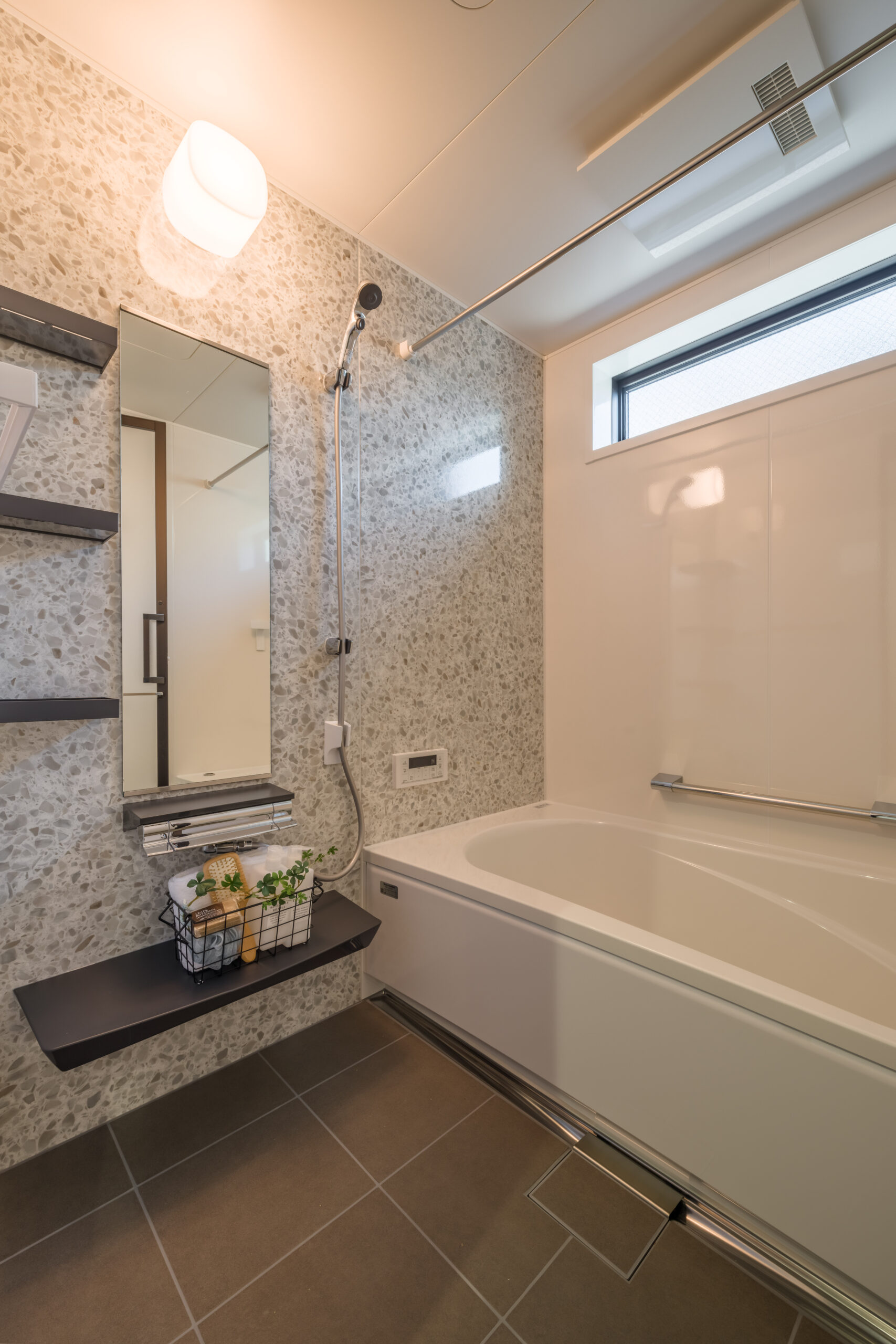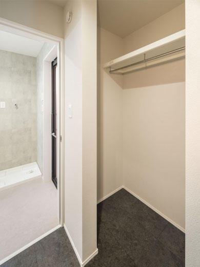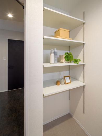 洗面室には、収納する物に合わせて高さを変えられる可動棚を完備。タオルや洗剤ストック、着替えなどを無駄なくスッキリ収納でき、清潔感あふれるサニタリー空間を保ちます。