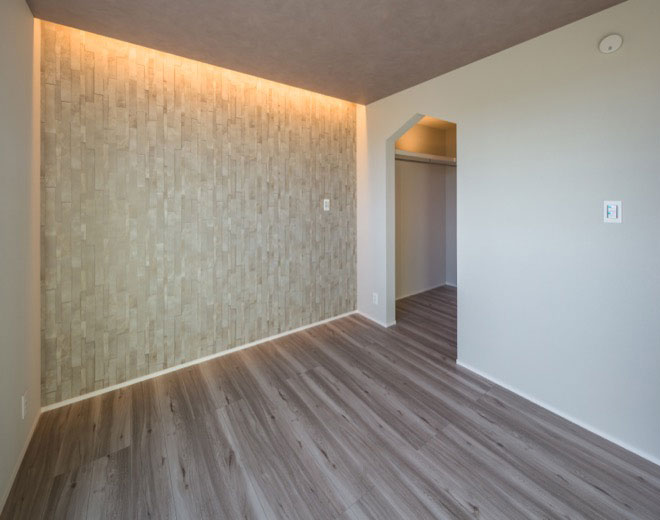 主寝室には、壁面を優しく照らす間接照明を採用。直接光が目に入らない柔らかな明かりが、一日の疲れを癒やし、ホテルライクで心地よい入眠を誘います。