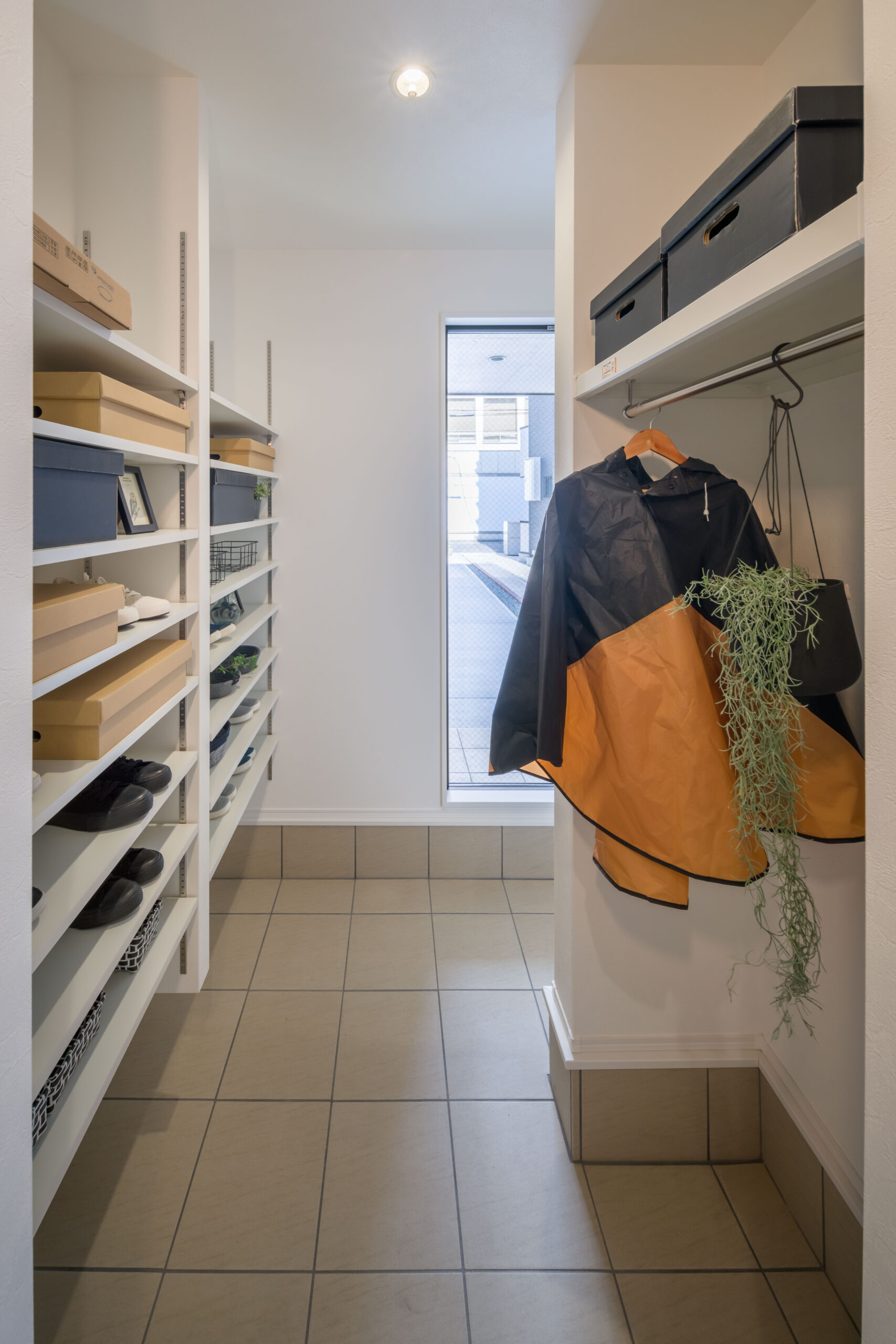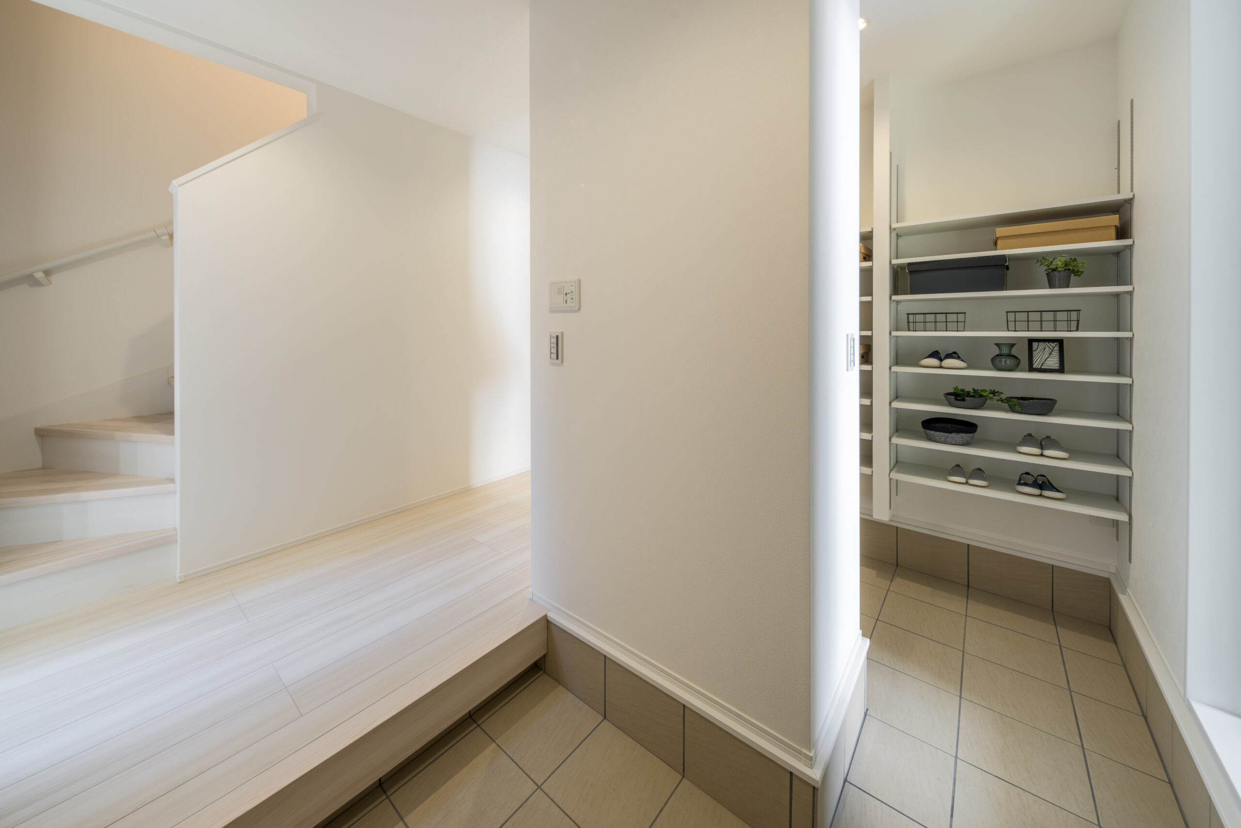 靴はもちろん、ベビーカーやアウトドア用品も収納できる大容量スペース。玄関に物が溢れるのを防ぎ、いつでも美しい入り口をキープできます。