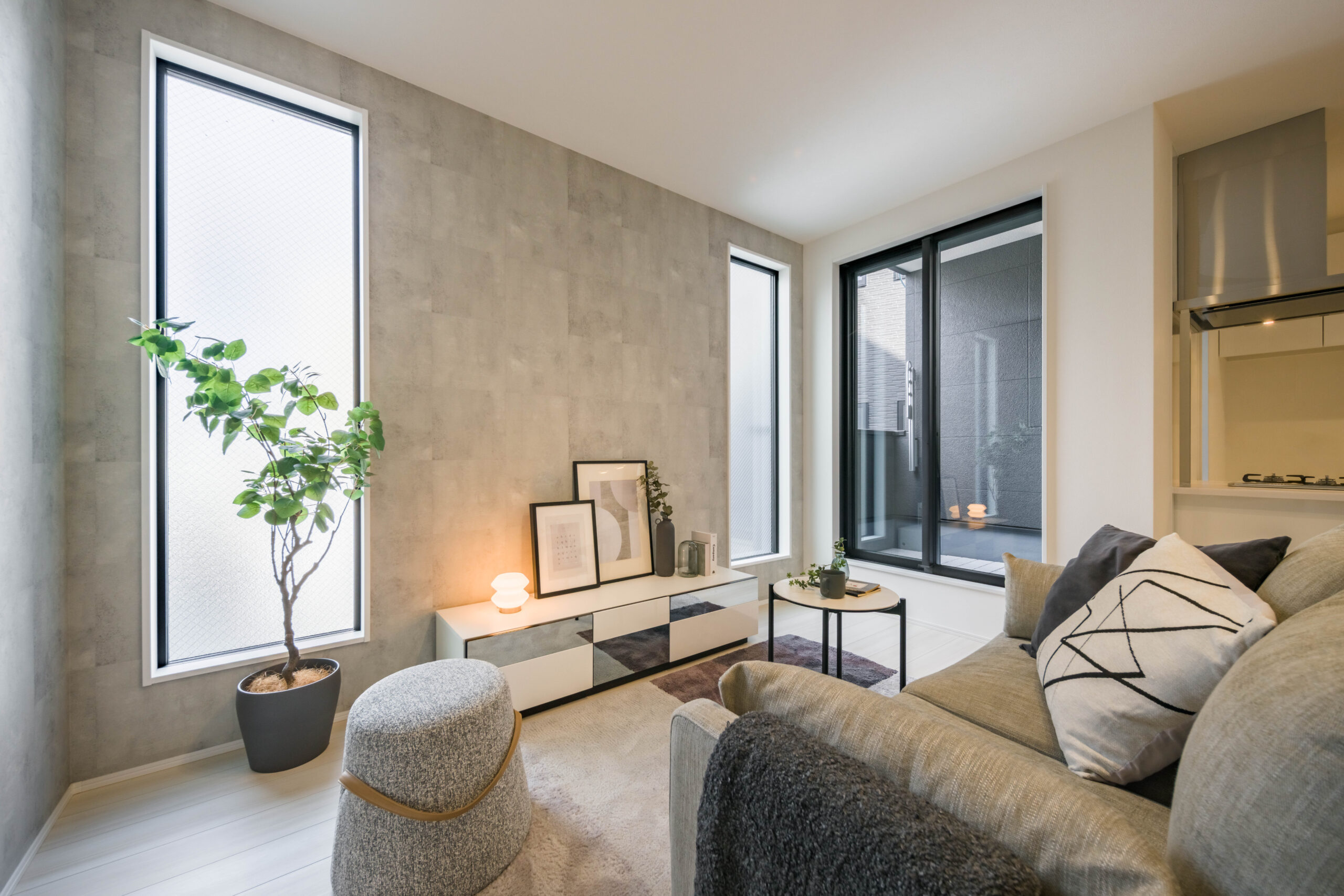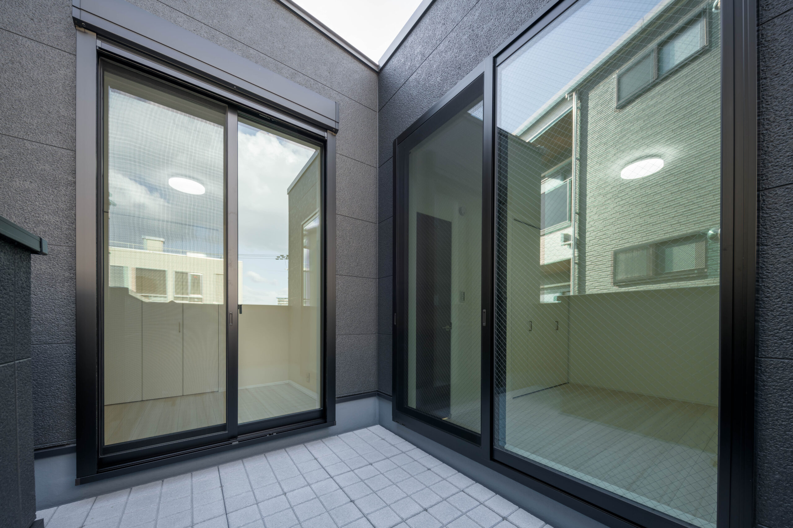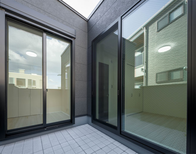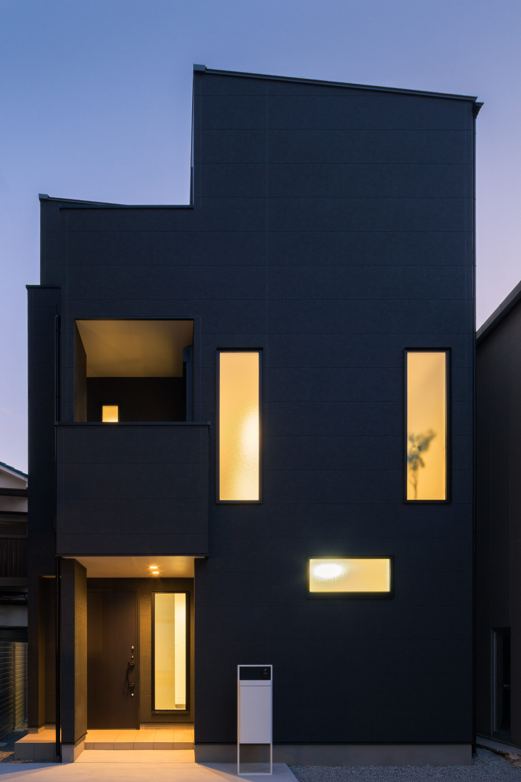 黒い外壁にたくさんの窓が並ぶ、印象的な外観デザイン。白い宅配ボックスがモノトーンのアクセントになり、機能性とデザイン性を両立させています。