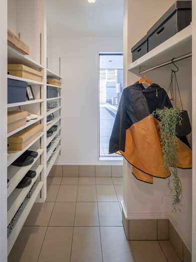 「家族用」と「来客用」で動線を分けられる2WAY設計。家族はシューズクローゼットを通って室内へ入れるため、急な来客時でも玄関ホールは常にスッキリ片付いた状態でお迎えできます。