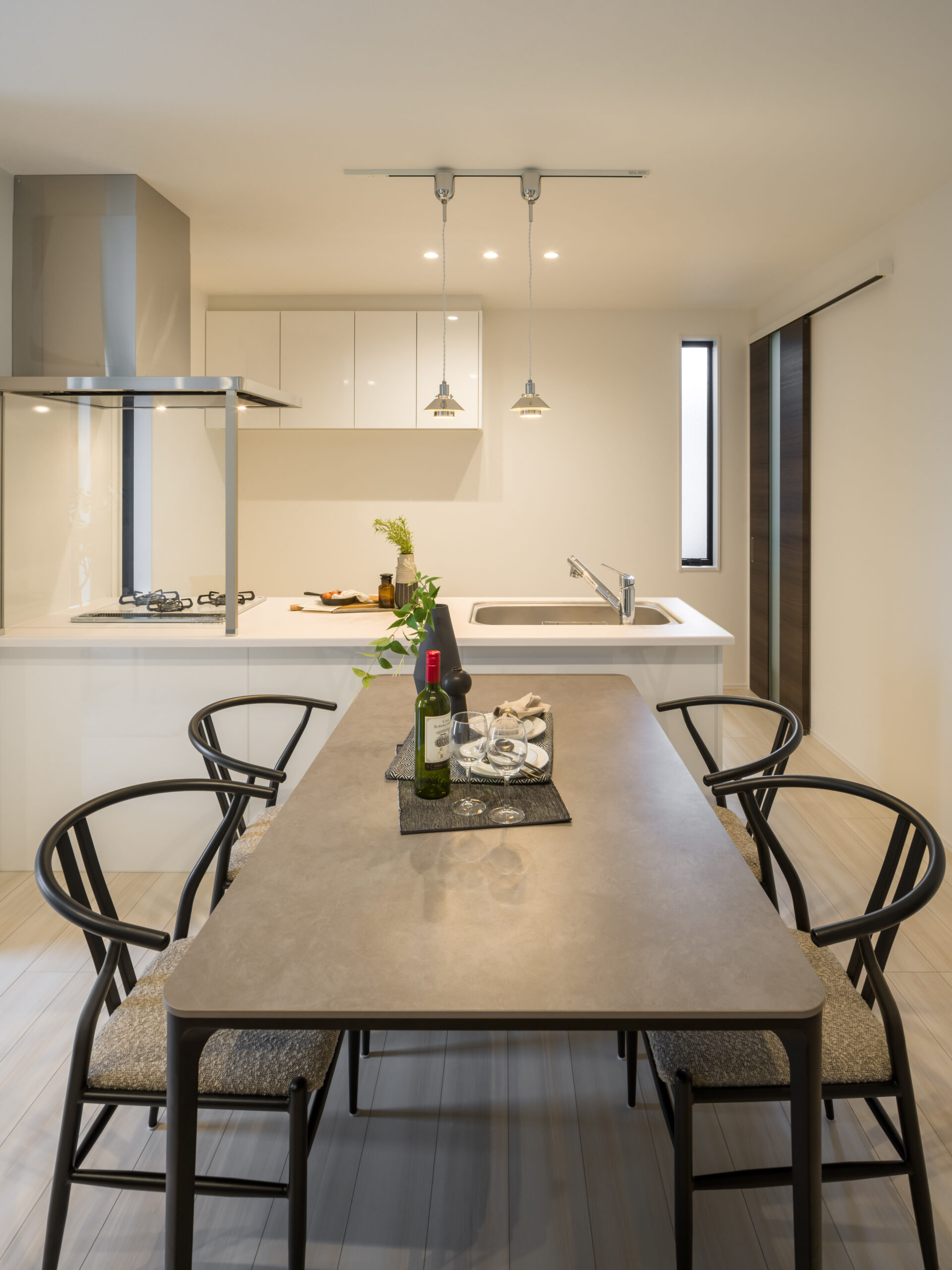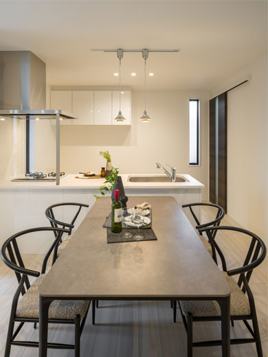 視界を遮る壁がなく、LDK全体を見渡せる開放的なキッチン。まるで家具のような美しいデザインで、リビングにいる家族と会話を弾ませながら楽しく料理ができます。