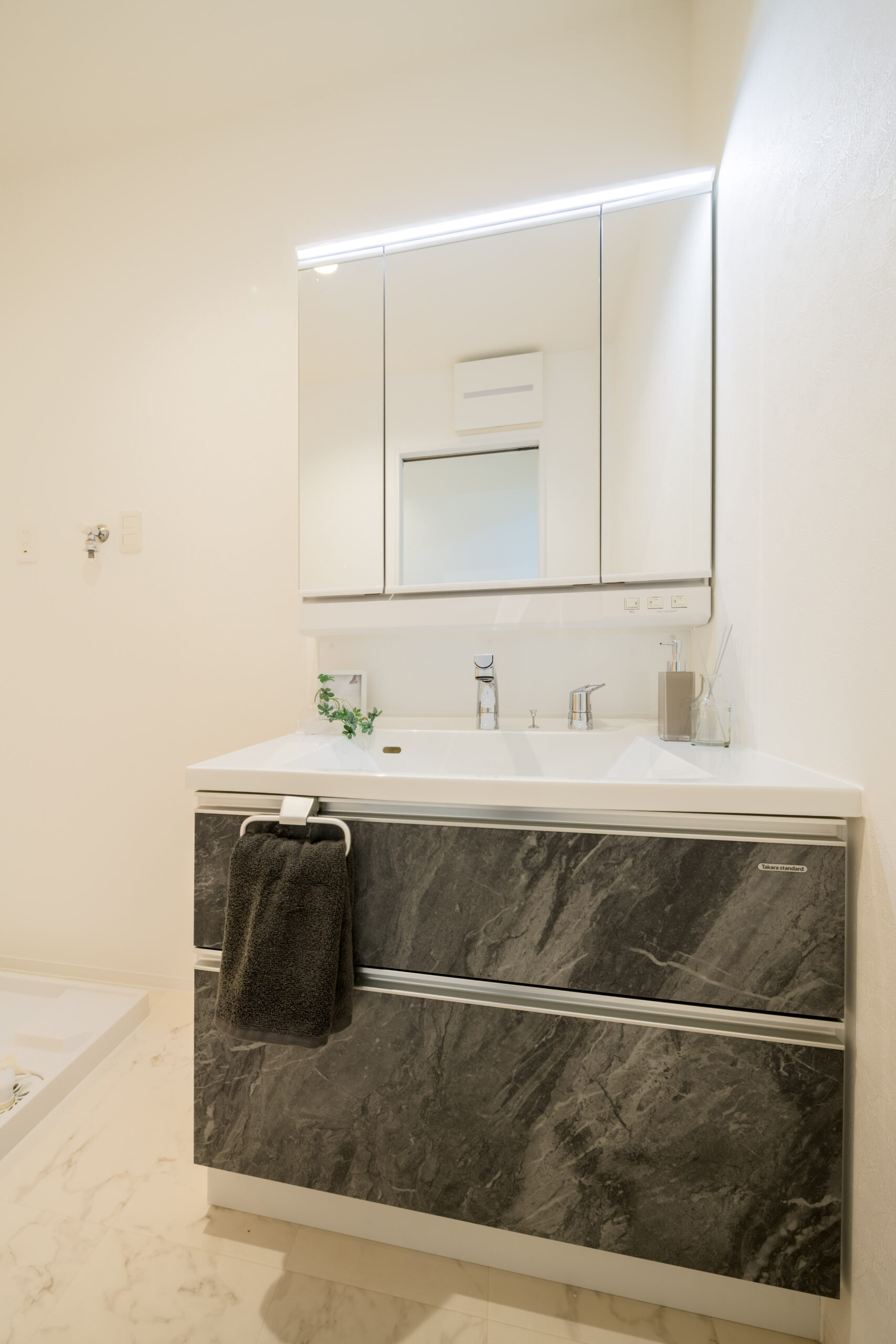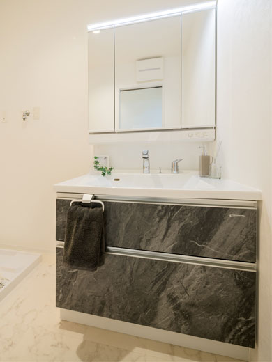 朝の忙しい時間帯も混み合わない、ゆとりの広さを確保。お子様の着替えやお風呂上がりのお世話もしやすく、リネン棚などを置いても広々と快適に使えます。