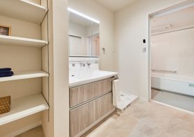 洗面室もホワイトナチュラル系の色をベースにし、木目をプラスしたやわらかい雰囲気でコーディネート。家族分の下着が収納できる可動棚も備え付けています。またキッチンの続きにあり、水回りが集中しているので家事がとてもスムーズ。
