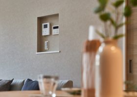 壁面にニッチを造り、照明や給湯器、インターホンなどのパネルやスイッチをまとめました。家事効率が良く、なによりスッキリしているのでインテリアや空間のデザインを邪魔しません。
