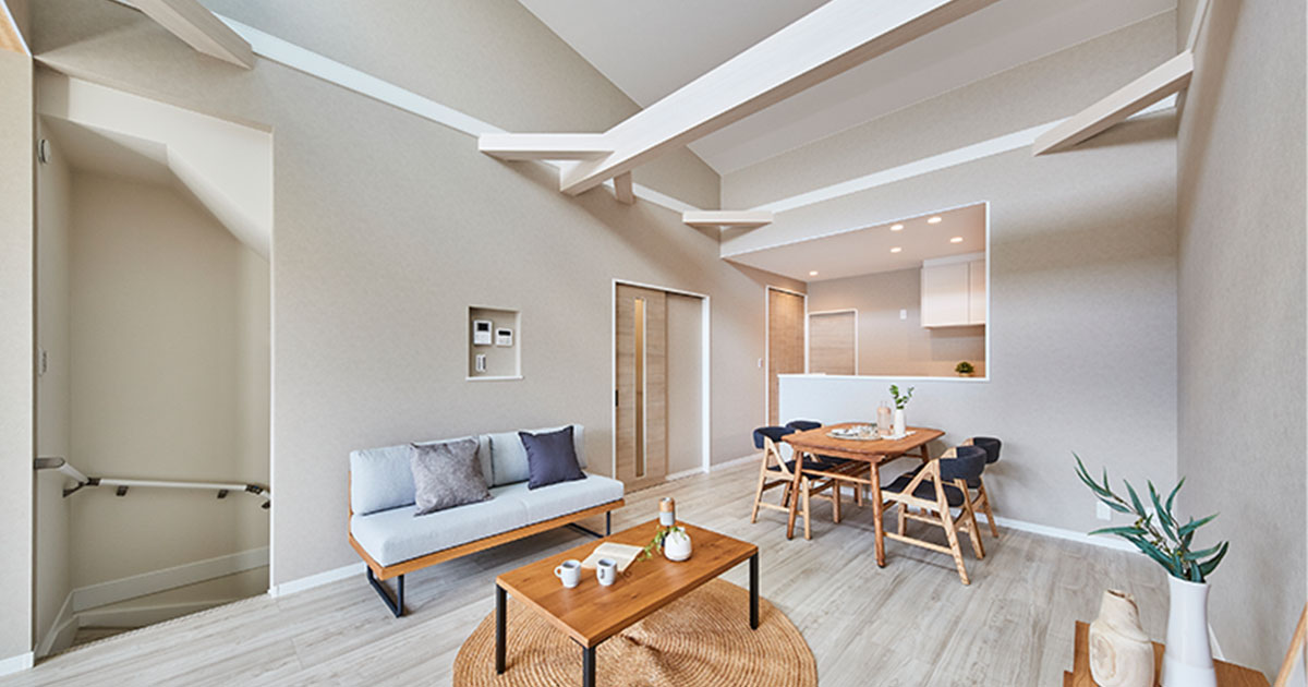 リビングには光を取り込みやすい勾配天井を採用。天井が高く感じられ、部屋全体に開放感をもたらしてくれます。