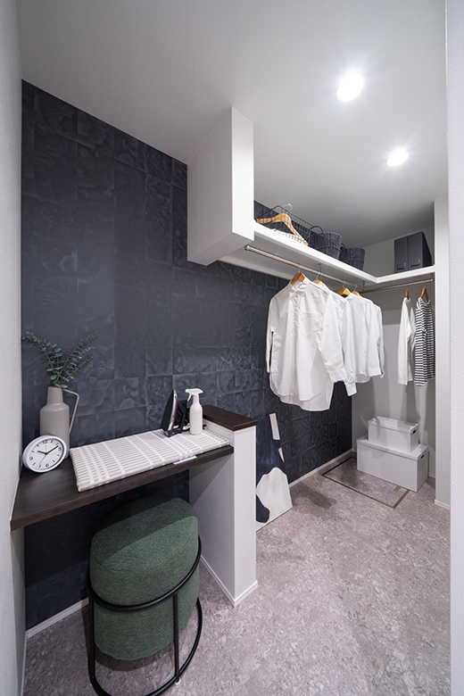 洗面室の奥に広々としたランドリースペースを設けました。カウンター付きでアイロンがけや衣類の仮置きに便利です。