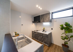 空間を有効活用できるⅡ型キッチンを採用。収納力も高く、昇降式の棚を備え、使い勝手の良い設計になっています。
