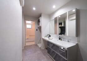 ワイドな洗面化粧台を採用し、広々とした空間を確保。下部にはキャスター付き収納を設置でき、使いやすさも考慮しました。