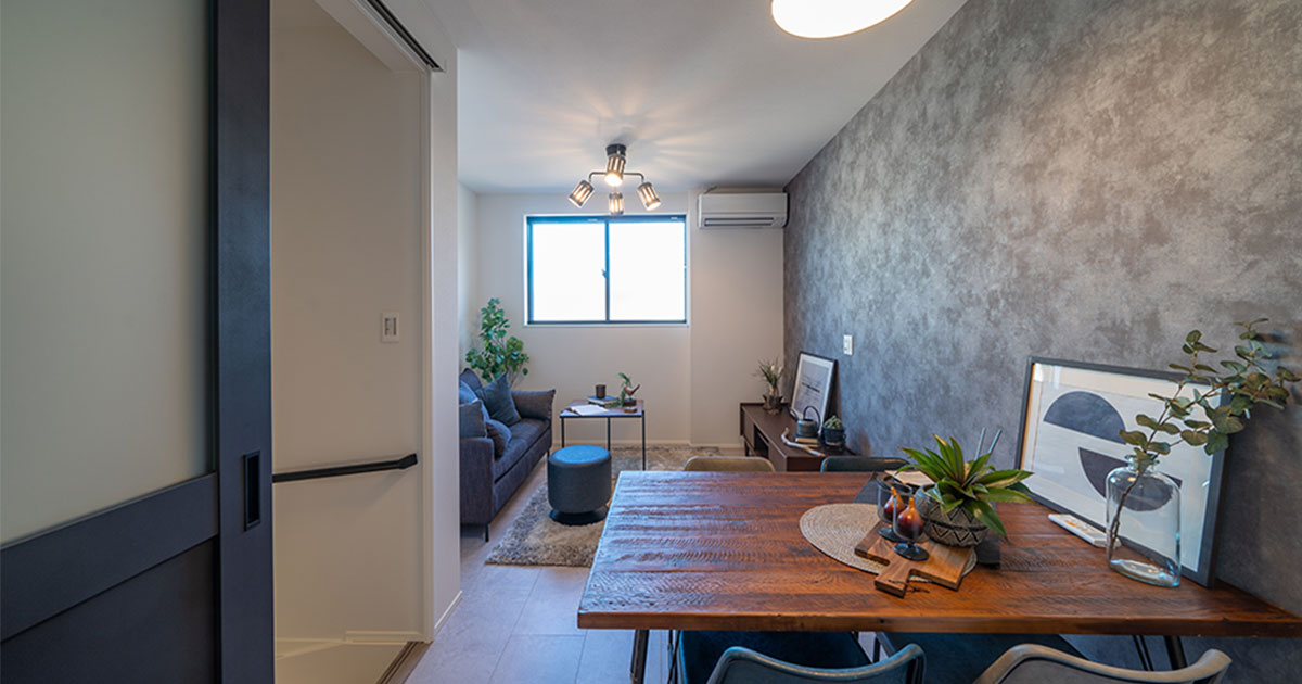 LDKは中央の壁でゆるく仕切られており、縦長の空間の広がりを感じながらもメリハリをつけて過ごすことができます。