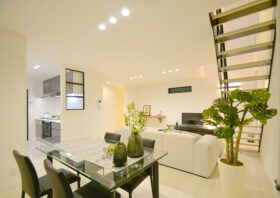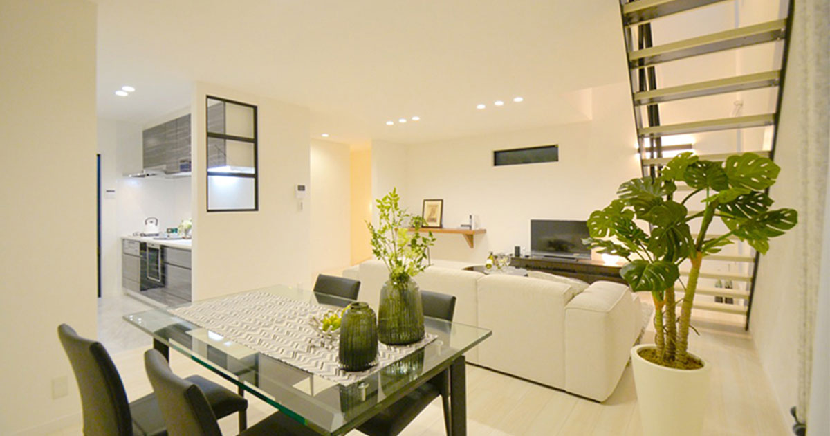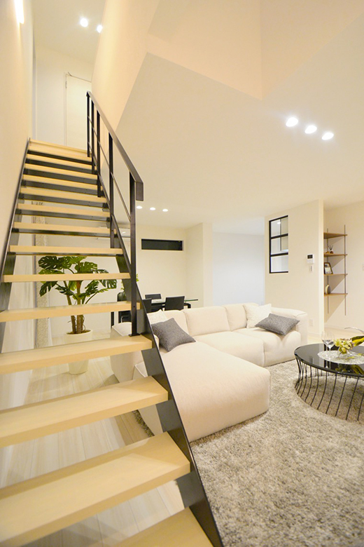 約24帖の広々としたLDKをスッキリと見せる、鉄骨造りのスケルトン階段を採用しました。開放的でおしゃれな空間に仕上がっています。階段上の吹抜けと天窓より光が落ちてきます。