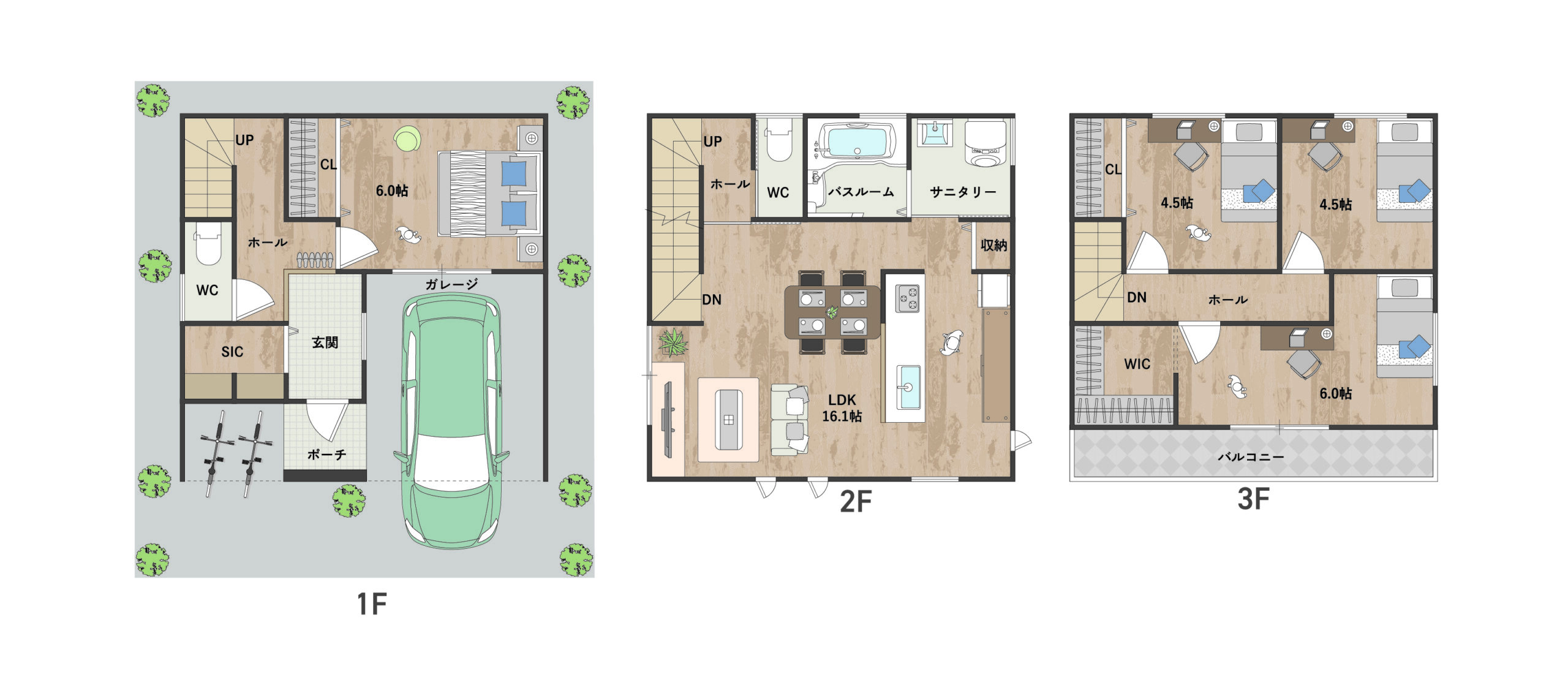 LDK+多目的フリースペース(3F)の3階建。将来は1階だけでも生活できる水回り動線。玄関扉前にデザイン壁を設けてあり、前の通りからの目線が気になりません。