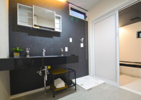 イタリア産タイルがモダンな雰囲気を醸し出す洗面室。浴室には肩湯・打たせ湯マッサージなどで疲れを癒せる高級バスを採用しています。住宅設備へのこだわりからも「豊かな時」を感じていただけます。