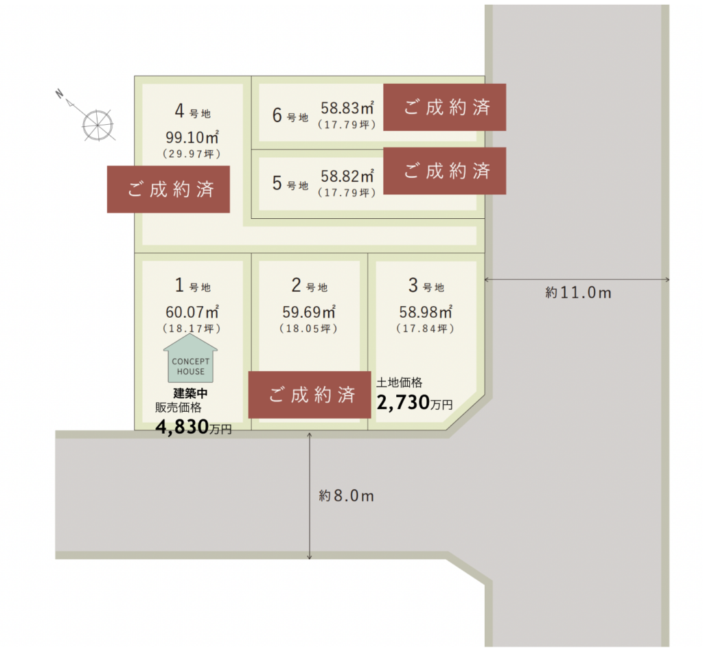 | 6号地 | 58.83㎡(17.80坪)※ご成約済 |