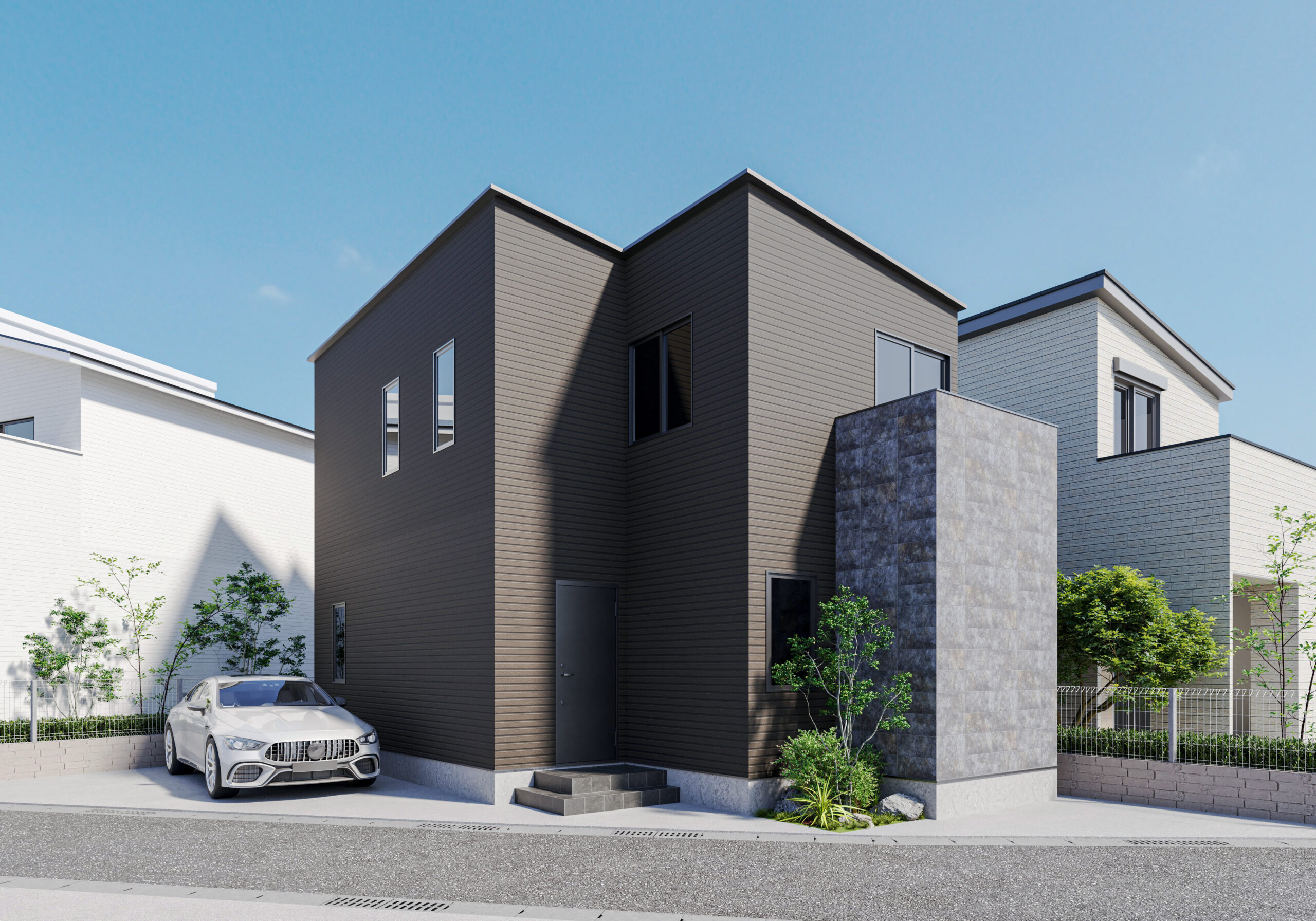 建物の外観は、縦長の滑り出し窓を採用することで縦方向のラインを意識し、カラーもブラック系で統一したスタイリッシュなデザインに仕上げています。