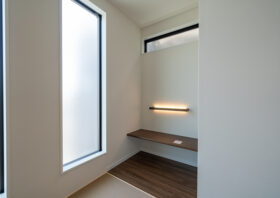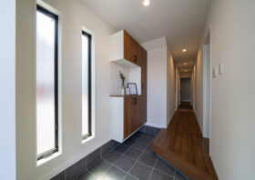 玄関にはななめ框を採用しており、広々とした印象を与えます。複数人が並んで靴を脱ぎ履きできるため、お出かけの際も混雑しません。