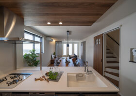 キッチン上部には折り下げ天井を採用し、空間に立体感とメリハリを生み出しており、LDK全体のアクセントにもなっています。