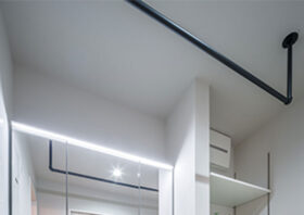洗面室にアイアンパイプを設置。洗濯機から取り出してその場ですぐに干せる最短動線を実現しました。移動の手間なく一日中室内干しができる、機能美溢れる空間です。
