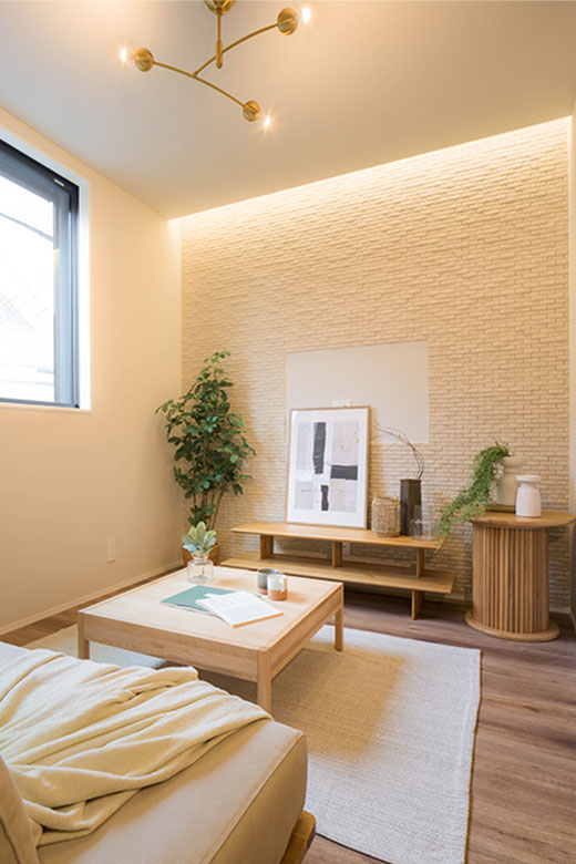 リビングの壁面にもエコカラットと間接照明を採用。柔らかな光が上質な素材感の陰影を美しく浮かび上がらせ、ホテルのような寛ぎの時間をドラマチックに演出します。