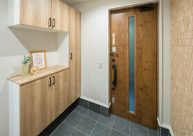 玄関には調湿・脱臭効果に優れた機能性壁材「エコカラット」を採用。デザイン性も高く、家族やお客様をいつも爽やかな空気と洗練された空間でお出迎えします。