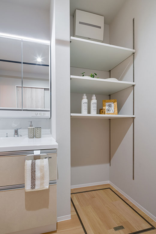 1階の洗面室には便利な棚収納をたっぷりと確保しました。かさばるタオルや洗剤、スキンケア用品などをスッキリ整理でき、朝の身支度もスムーズに行えます。