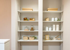 キッチンの近くには便利なパントリー(食品庫)を完備。食品のストックや日用品、大きめの調理家電などをしっかり収納でき、キッチン周りを常に美しく保てます。
