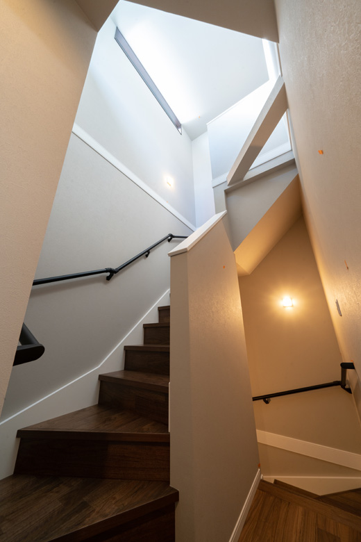 2階から3階へとつながる階段は吹抜けに。窓からの採光もあり、明るさと解放感が生まれます。