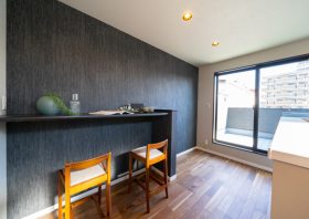 3階ホールにはカウンターを設けています。バルコニーで遊ぶ子供を見守るもよし、一人の集中作業に使用するもよし、シーンに合わせて自由に使えるのが魅力です。