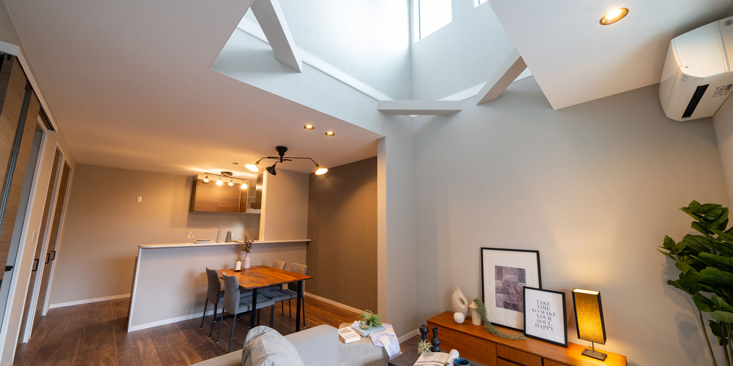リビング上部は吹き抜けになっており、3階部分の大きな窓からはたくさんの光を取り込むことができます。