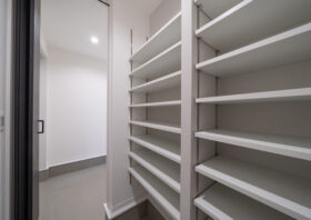 キッチン背面には可動式の棚が付いたパントリーを設けていて、食材や調理家電を収納しておくことができます。