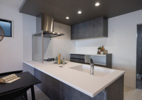 キッチンは壁のないフラット仕様で圧迫感がなく、広々と調理ができます。シンクには人造大理石を採用し、見た目がスッキリするだけでなく、傷や汚れにも強い特徴があります。